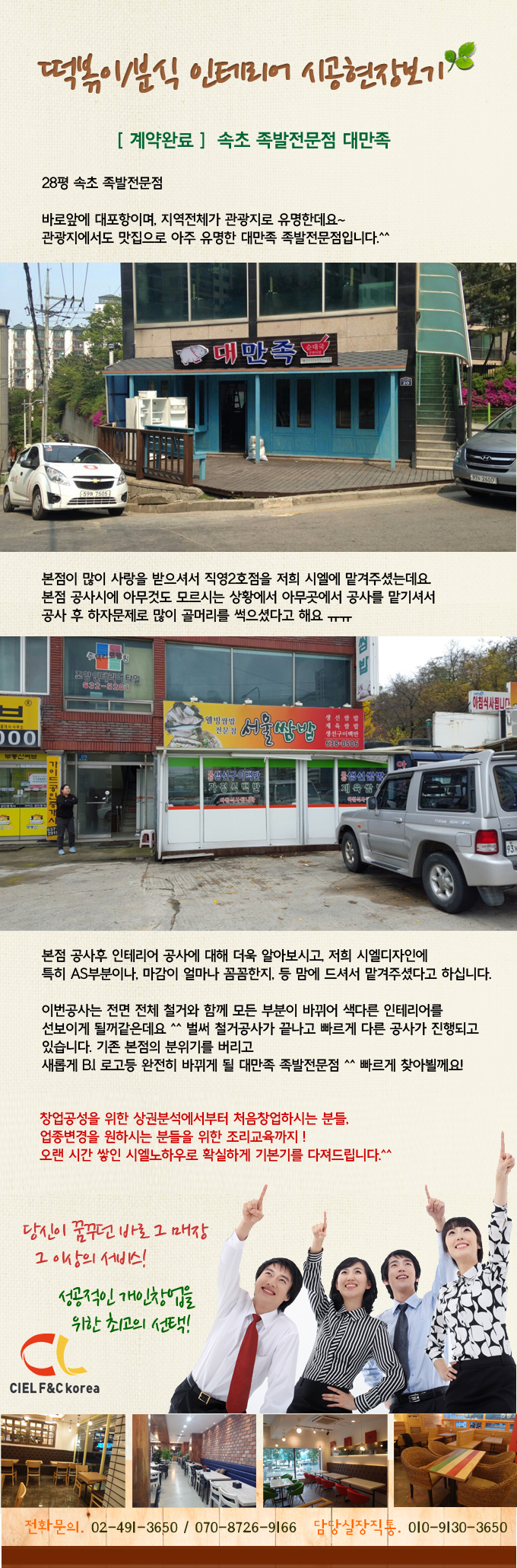 [계약]속초 족발전문점 대만족 페이지 정보 작성자 시엘에프앤씨 댓글 0건 조회 3,748회 작성일 15-11-24 13:38 본문 [계약]속초 족발전문점 대만족 목록 답변 이전글[계약]중계동 김밥전문점 솜씨 15.12.04 다음글[계약]밥보야 김밥전문점 평촌점 15.11.17 등록된 댓글이 없습니다.